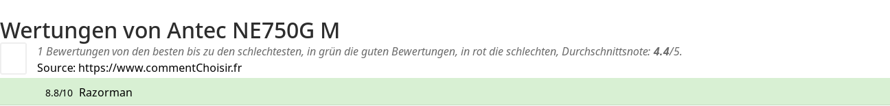 Antec NE750G M test : Wir haben nur eine Rezension zu diesem Produkt gefunden, daher klingt es schwierig, einen globalen Ratschlag zu geben. Diese durchschnittliche Bewertung von 4/5 ist möglicherweise nicht repräsentativ.