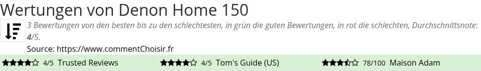 Hier sind alle 3 tests und Bewertungen zu Lautsprecher Denon Home 150 mit den 3 Bewertungen und Kommentaren der Tester in ihrem Test.