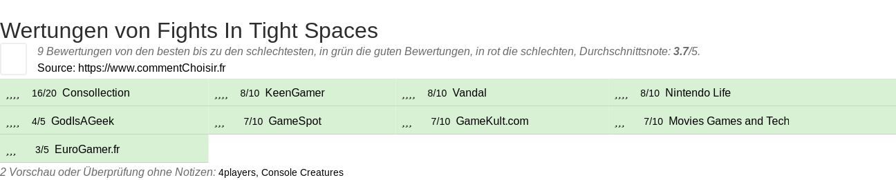 Hier sind alle 11 tests und Bewertungen zu Videospiele Fights In Tight Spaces mit den 9 Bewertungen und Kommentaren der Tester in ihrem Test.