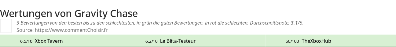 Hier sind alle 3 tests und Bewertungen zu Videospiele Gravity Chase mit den 3 Bewertungen und Kommentaren der Tester in ihrem Test.