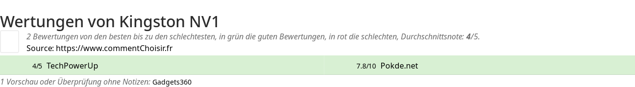 Hier sind alle 3 tests und Bewertungen zu Festplatten Kingston NV1 mit den 2 Bewertungen und Kommentaren der Tester in ihrem Test.