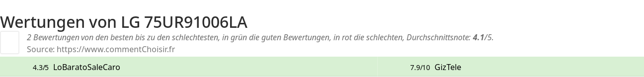 Hier sind alle 4 tests und Bewertungen zu Fernseher LG 75UR91006LA mit den 4 Bewertungen und Kommentaren der Tester in ihrem Test.
