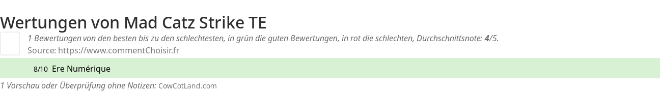 Mad Catz Strike TE test : Wir haben nur eine Rezension zu diesem Produkt gefunden, daher klingt es schwierig, einen globalen Ratschlag zu geben. Diese durchschnittliche Bewertung von 4/5 ist möglicherweise nicht repräsentativ.