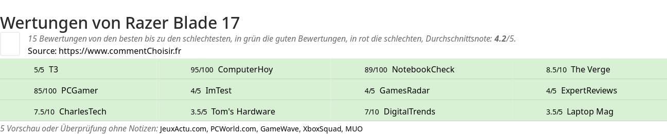 Razer Blade 17 test : Mit einer durchschnittlichen Bewertung von 4.1/5 können Sie Razer Blade 17 mit geschlossenen Augen (oder fast) kaufen. Die Meinungen der Tester scheinen einhellig zu sein!
