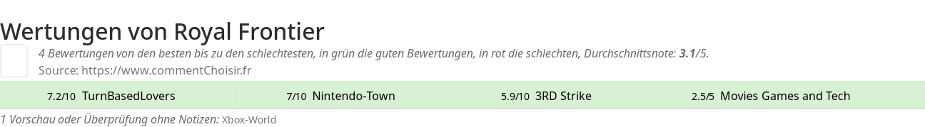 Hier sind alle 5 tests und Bewertungen zu Videospiele Royal Frontier mit den 4 Bewertungen und Kommentaren der Tester in ihrem Test.