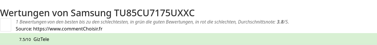 Hier sind alle 2 tests und Bewertungen zu Fernseher Samsung TU85CU7175UXXC mit den 2 Bewertungen und Kommentaren der Tester in ihrem Test.