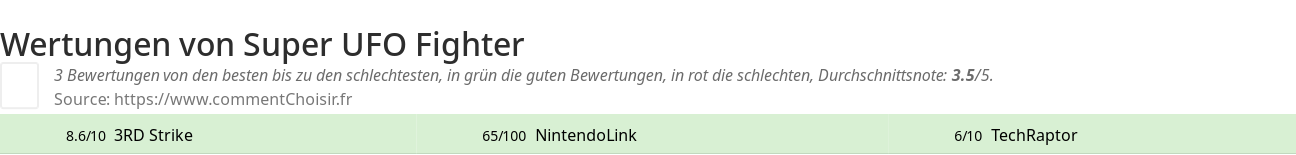 Hier sind alle 3 tests und Bewertungen zu Videospiele Super UFO Fighter mit den 3 Bewertungen und Kommentaren der Tester in ihrem Test.