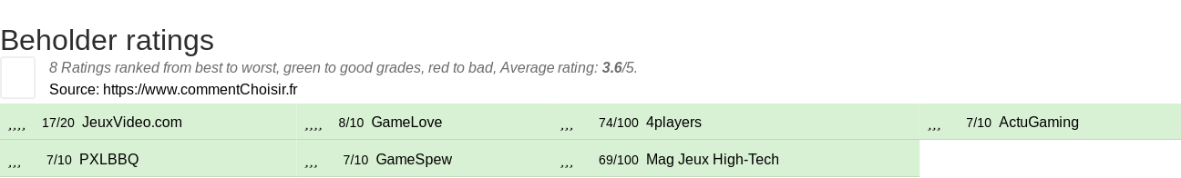 Theses reviews and tests from Video Games magazines and websites give 8 ratings, we get this average rating to this Beholder product : 3.6/5.