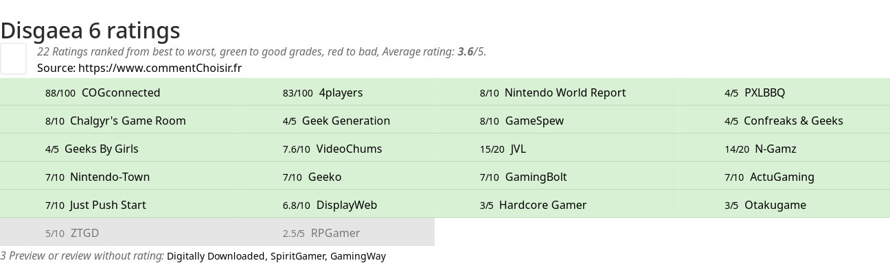 Theses reviews and tests from Video Games magazines and websites give 22 ratings, we get this average rating to this Disgaea product : 3.6/5.