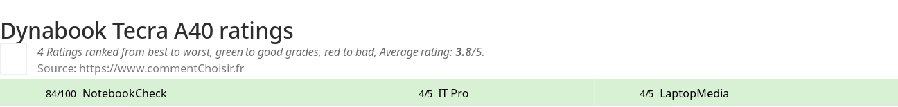 Theses reviews and tests from Laptops magazines and websites give 4 ratings, we get this average rating to this Dynabook product : 3.8/5.