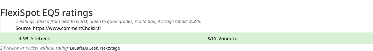 Theses reviews and tests from Gaming and Streaming magazines and websites give 2 ratings, we get this average rating to this FlexiSpot product : 4/5.