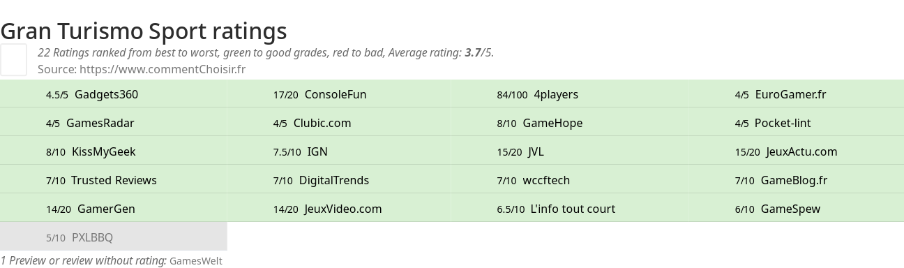 Theses reviews and tests from Video Games magazines and websites give 22 ratings, we get this average rating to this Gran Turismo product : 3.7/5.