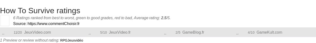 Theses reviews and tests from Video Games magazines and websites give 6 ratings, we get this average rating to this How To Survive product : 2.5/5.
