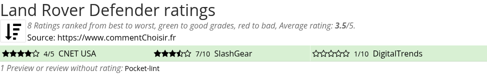 Theses reviews and tests from Cars magazines and websites give 8 ratings, we get this average rating to this Land Rover product : 3.5/5.