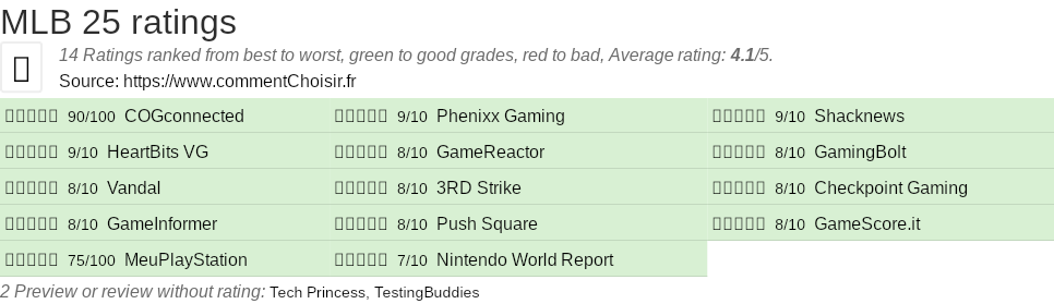 Theses reviews and tests from Video Games magazines and websites give 14 ratings, we get this average rating to this MLB product : 4.1/5.