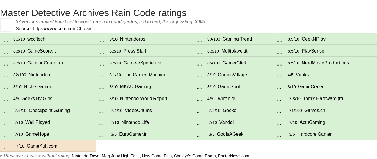Theses reviews and tests from Video Games magazines and websites give 37 ratings, we get this average rating to this Master Detective Archives product : 3.8/5.