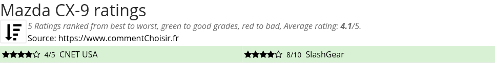 Theses reviews and tests from Cars magazines and websites give 5 ratings, we get this average rating to this Mazda product : 4.1/5.