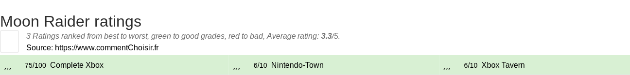 Theses reviews and tests from Video Games magazines and websites give 3 ratings, we get this average rating to this Moon Raider product : 3.3/5.
