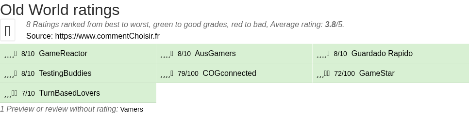 Theses reviews and tests from Video Games magazines and websites give 8 ratings, we get this average rating to this Old World product : 3.8/5.