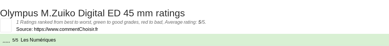 Olympus M.Zuiko Digital ED 45 mm review : We found only one review on this product, so it sounds difficult to give a global advice, this average rating of 5/5 may not be representative.