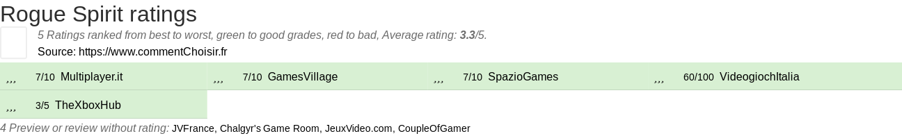 Theses reviews and tests from Video Games magazines and websites give 5 ratings, we get this average rating to this Rogue Spirit product : 3.3/5.