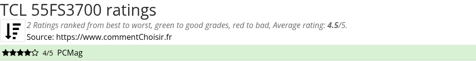 Theses reviews and tests from Televisions magazines and websites give 2 ratings, we get this average rating to this TCL product : 4.5/5.