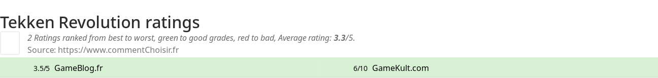 Theses reviews and tests from Video Games magazines and websites give 2 ratings, we get this average rating to this Tekken product : 3/5.