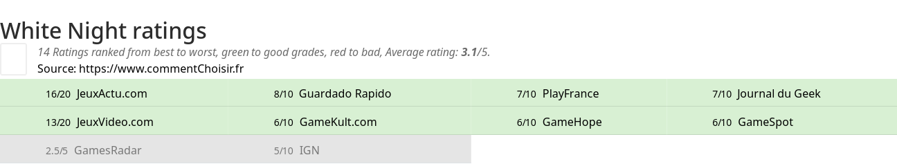 Theses reviews and tests from Video Games magazines and websites give 14 ratings, we get this average rating to this White Night product : 3/5.