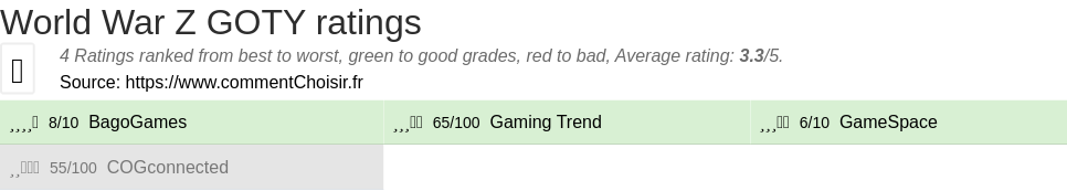 Theses reviews and tests from Video Games magazines and websites give 4 ratings, we get this average rating to this World War Z product : 3.3/5.