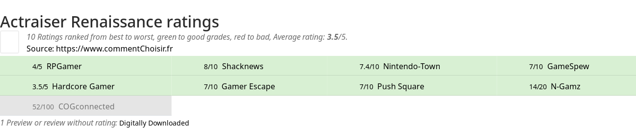Theses reviews and tests from Video Games magazines and websites give 10 ratings, we get this average rating to this Actraiser product : 3.5/5.