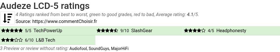 Theses reviews and tests from Headphones magazines and websites give 4 ratings, we get this average rating to this Audeze product : 4.1/5.