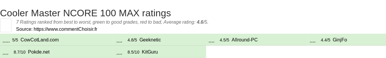 Theses reviews and tests from Components magazines and websites give 7 ratings, we get this average rating to this Cooler Master product : 4.1/5.