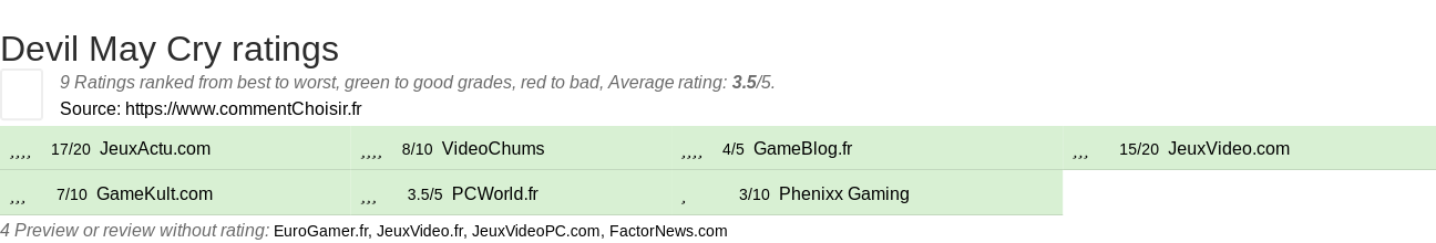 Theses reviews and tests from Video Games magazines and websites give 9 ratings, we get this average rating to this Devil May Cry product : 3.5/5.