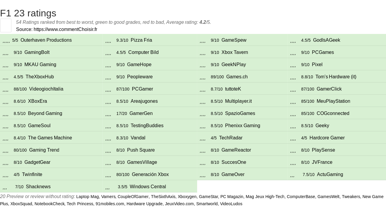 Theses reviews and tests from Video Games magazines and websites give 55 ratings, we get this average rating to this F1 product : 4.1/5.