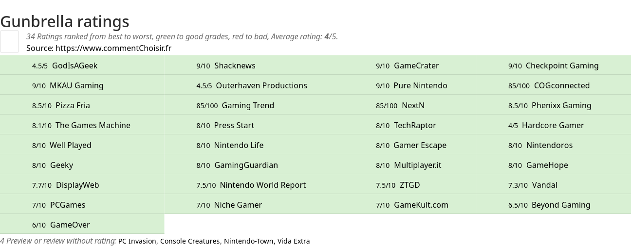 Theses reviews and tests from Video Games magazines and websites give 35 ratings, we get this average rating to this Gunbrella product : 3.9/5.