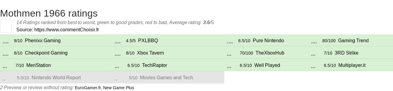 Theses reviews and tests from Video Games magazines and websites give 14 ratings, we get this average rating to this Mothmen 1966 product : 3.5/5.