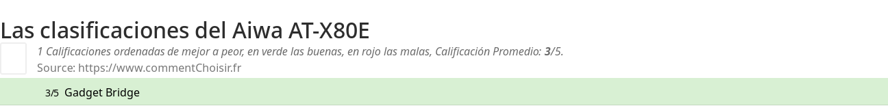 Entre estas pruebas de sitios de Internet y revistas especializadas en Auriculares, 1 dieron una calificación y obtenemos una calificación promedio de 3/5 para este producto Aiwa.
