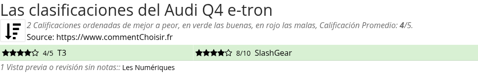 Aquí están las 3 revisiones y pruebas encontradas en el Carro Audi Q4 e-tron con las 2 calificaciones y comentarios de los evaluadores en su revisión.