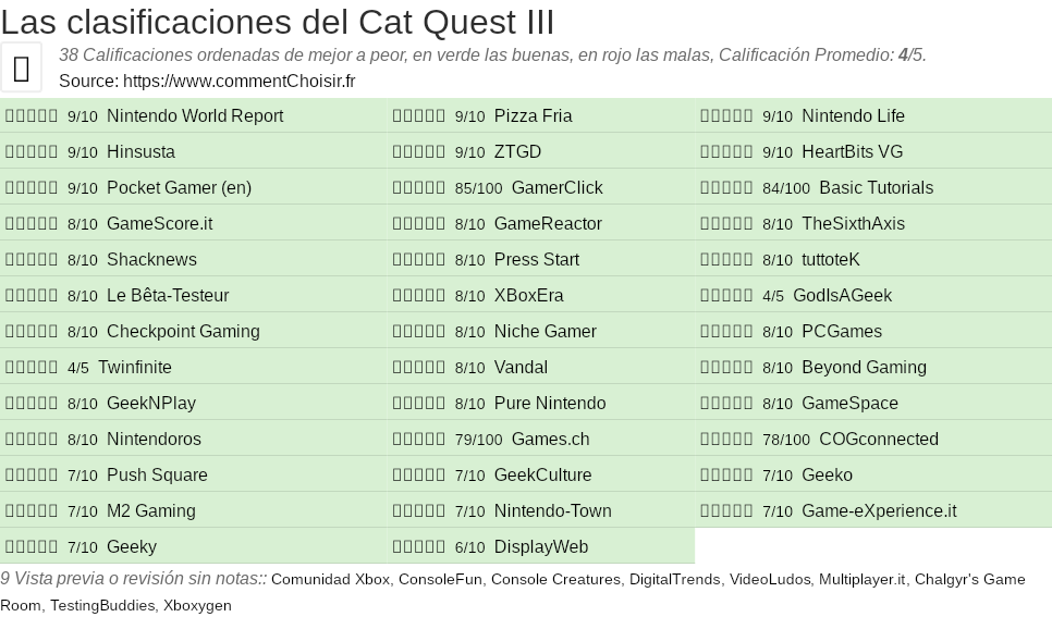 Entre estas pruebas de sitios de Internet y revistas especializadas en Videojuego, 38 dieron una calificación y obtenemos una calificación promedio de 4/5 para este producto Cat Quest.