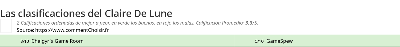 Entre estas pruebas de sitios de Internet y revistas especializadas en Videojuego, 2 dieron una calificación y obtenemos una calificación promedio de 3.3/5 para este producto Claire De Lune.