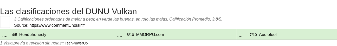 Entre estas pruebas de sitios de Internet y revistas especializadas en Auriculares, 3 dieron una calificación y obtenemos una calificación promedio de 3.8/5 para este producto DUNU.