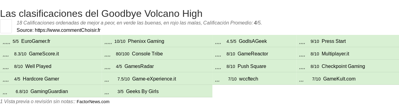 Entre estas pruebas de sitios de Internet y revistas especializadas en Videojuego, 18 dieron una calificación y obtenemos una calificación promedio de 3.9/5 para este producto Goodbye Volcano High.