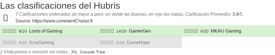 Entre estas pruebas de sitios de Internet y revistas especializadas en Videojuego, 7 dieron una calificación y obtenemos una calificación promedio de 3.4/5 para este producto Hubris.