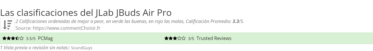 Entre estas pruebas de sitios de Internet y revistas especializadas en Auriculares, 2 dieron una calificación y obtenemos una calificación promedio de 3/5 para este producto JLab.