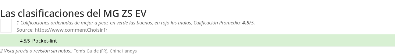 Entre estas pruebas de sitios de Internet y revistas especializadas en Carro, 1 dieron una calificación y obtenemos una calificación promedio de 4/5 para este producto MG.
