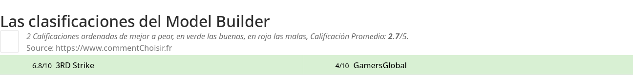 Entre estas pruebas de sitios de Internet y revistas especializadas en Videojuego, 2 dieron una calificación y obtenemos una calificación promedio de 2.5/5 para este producto Model Builder.