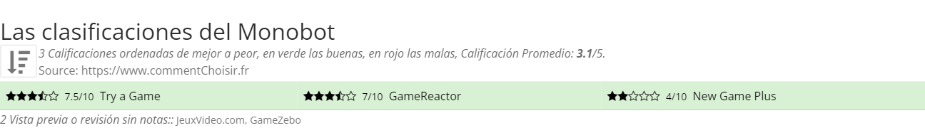 Entre estas pruebas de sitios de Internet y revistas especializadas en Videojuego, 4 dieron una calificación y obtenemos una calificación promedio de 3.3/5 para este producto Monobot.