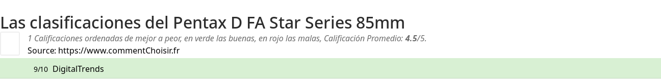 Entre estas pruebas de sitios de Internet y revistas especializadas en Lentes de cámara, 1 dieron una calificación y obtenemos una calificación promedio de 4.5/5 para este producto Pentax.