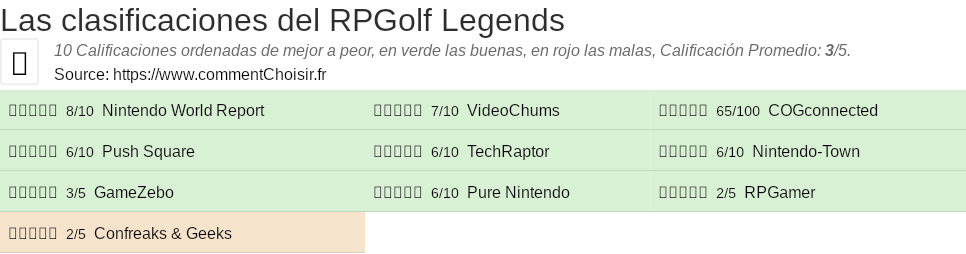 Entre estas pruebas de sitios de Internet y revistas especializadas en Videojuego, 10 dieron una calificación y obtenemos una calificación promedio de 3/5 para este producto RPGolf Legends.