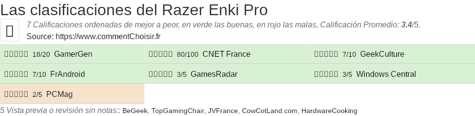 Las calificaciones de los sitios de Internet y las revistas pueden estar sesgadas, al menos con las reseñas de los clientes y los usuarios que compraron Razer Enki Pro en Amazon o Fnac, estamos seguros de que tenemos reseñas reales sobre este producto. (los enlaces a las tiendas son patrocinados)